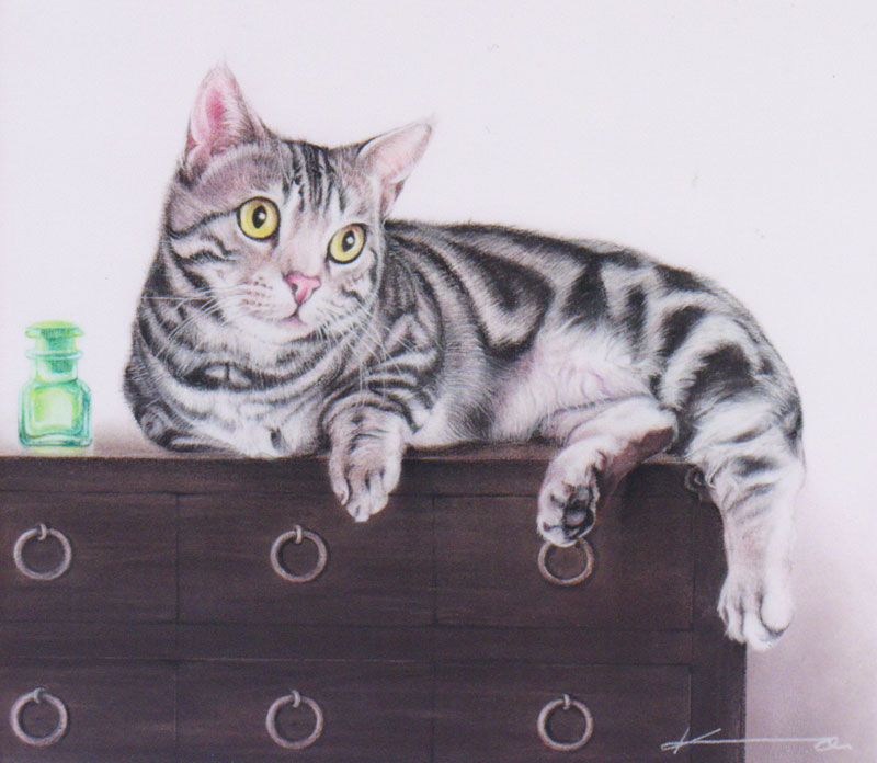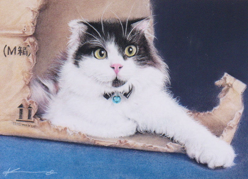 そして、特に視線のやさしさ、毛並みのフワフワしたやわらかさを重視し描き続けたリアルな絵で、人との生活の中にいるペットたちの表情、空気感を大切にした作品達です。